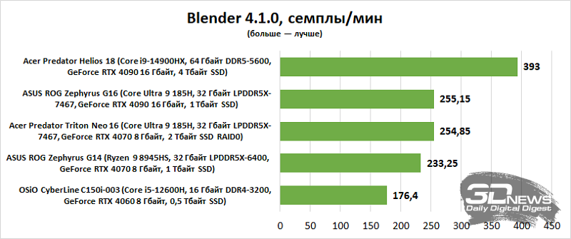 - Liquidificador 4.1.0. Determinando a velocidade final de renderização em um dos populares pacotes gráficos 3D gratuitos. A velocidade de construção de cenas padrão (monstro, sucata, sala de aula) usadas para medir o desempenho é medida.