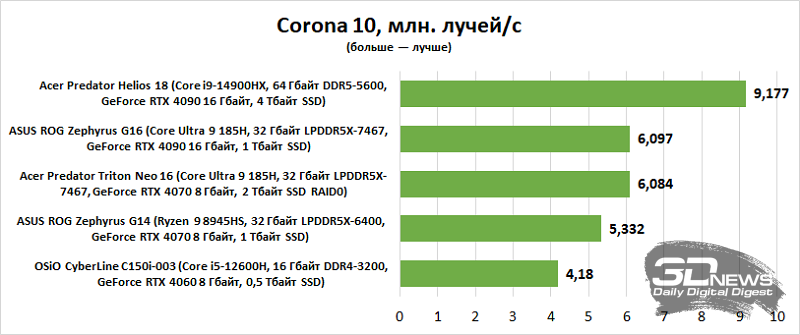 - Referência Corona 10. Testando a velocidade de renderização usando o renderizador de mesmo nome. A velocidade de construção de uma cena padrão usada para medir o desempenho é medida.