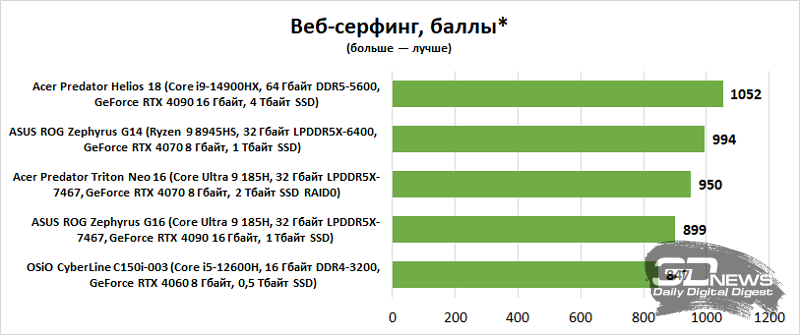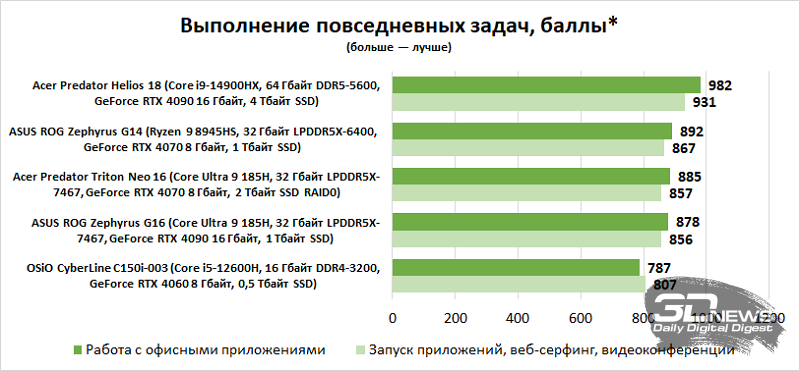 Deixando os jogos de lado, a maioria dos usuários nem sempre precisa do alto desempenho de um laptop. A pessoa média que passa o tempo em um laptop navega na web, assiste a vídeos e ouve música, se comunica por meio de mensagens instantâneas, realiza videoconferências e, às vezes, usa pacotes de aplicativos de escritório. Como regra, para executar tais tarefas, é necessário alto desempenho com 1-2 núcleos de CPU, RAM suficiente e armazenamento rápido. Os testes a seguir mostram como os laptops para jogos lidam bem com as tarefas diárias do usuário.