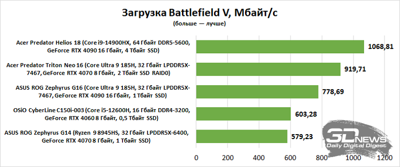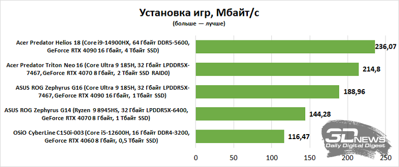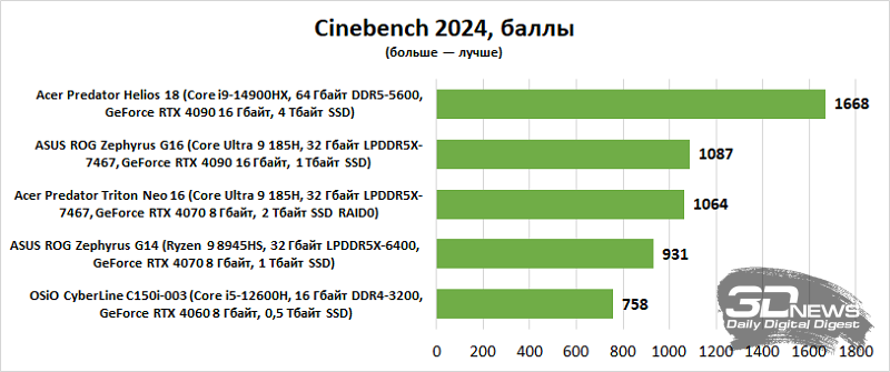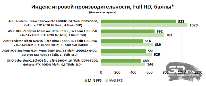 Você pode ver por si mesmo: laptops com gráficos GeForce RTX 4060 não são, em média, muito inferiores aos modelos com GeForce RTX 4070 – apesar da enorme diferença de preço. FPS abstratamente confortável foi obtido em 11 jogos de 12. Em projetos AAA como Black Myth: Wukong, você terá que reduzir a qualidade gráfica ou usar DLSS.