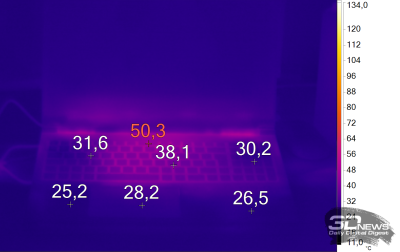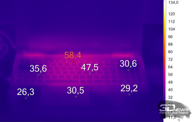 Como você pode ver, o corpo do laptop fica visivelmente quente na parte central, especialmente no modo “Desempenho”. Felizmente, as mãos de um jogador geralmente ficam nas laterais, onde não são observadas altas temperaturas.