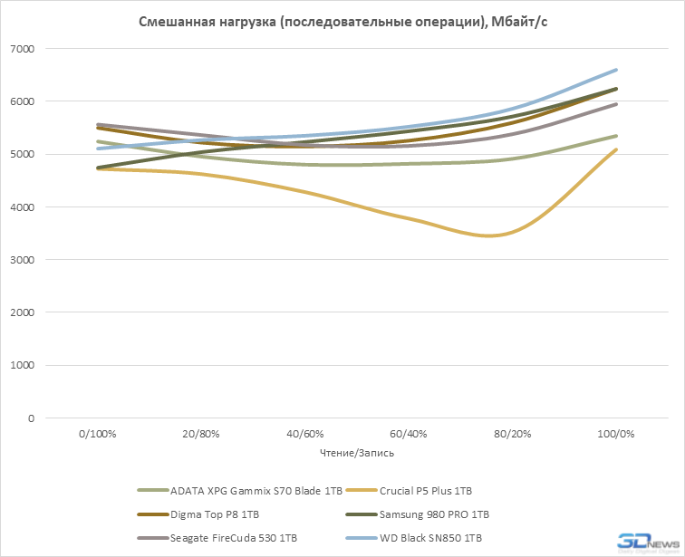 No entanto, deve-se ter em mente que os drives baseados em controladores Phison são deliberadamente otimizados para medições de desempenho sintético e em tais testes eles parecem um pouco melhores do que sob cargas reais. Portanto, não se deve surpreender que em leitura e escrita linear, o Digma Top P8, junto com o Seagate FireCuda 530, estejam no topo dos diagramas. Além disso, o Top P8 funciona bem em cargas de trabalho mistas, quase no mesmo nível do desempenho do WD Black SN850.