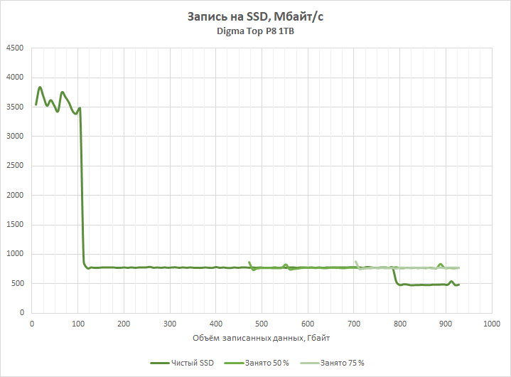 Quanto aos princípios gerais de cache SLC no Digma Top P8, este drive usa um algoritmo dinâmico. Em um SSD de terabyte vazio, o cache SLC é de cerca de 100 GB. No entanto, depois de preencher todo o volume da unidade com dados e liberar espaço nele, o cache do SLC para de funcionar. Esta é uma desvantagem bastante desagradável do Top P8, mas não se aplica tanto a este SSD especificamente, mas a toda a plataforma Phison E18 – outras unidades baseadas nele também sofrem de uma doença semelhante.
