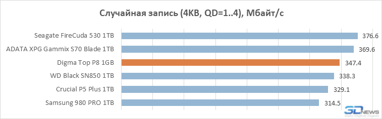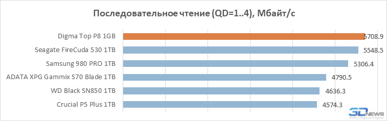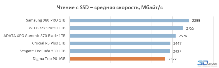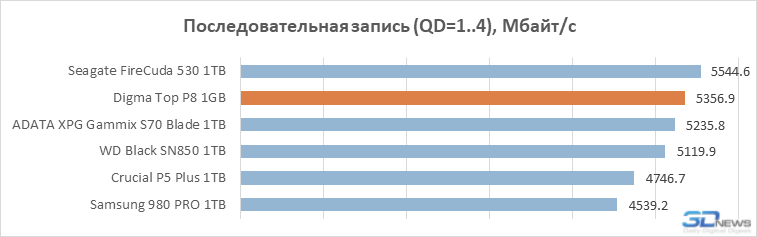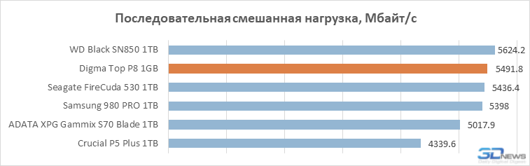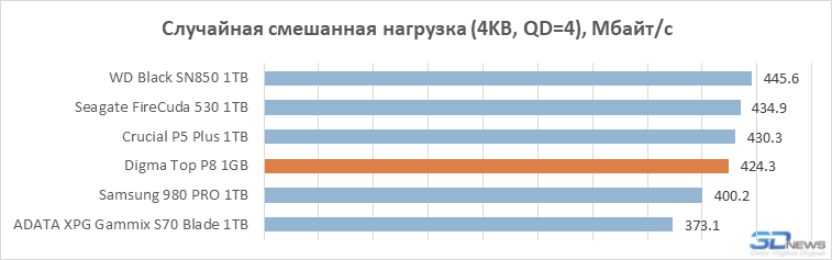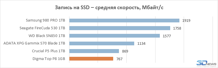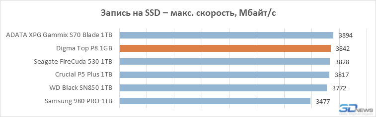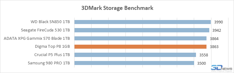 Em cargas de jogos, o Digma Top P8 parece confiante. Embora fique atrás do Seagate FireCuda 530 e WD Black SN850, a quantidade desse atraso é insignificante. Portanto, pode ser recomendado para uso em montagens de jogos do mais alto nível.