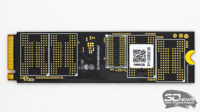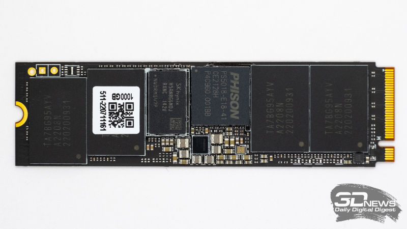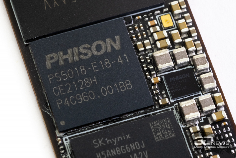 A coisa mais interessante está escondida sob o adesivo – a plataforma de hardware. A análise considera um SSD de 1 TB e acabou sendo montado a partir de seis chips, colocados na placa de maneira bastante bizarra. No centro está o controlador Phison PS5018-E18, ao lado dele está um chip de buffer SDRAM DDR4-1600 gigabyte e nas bordas estão dois chips TLC 3D NAND.