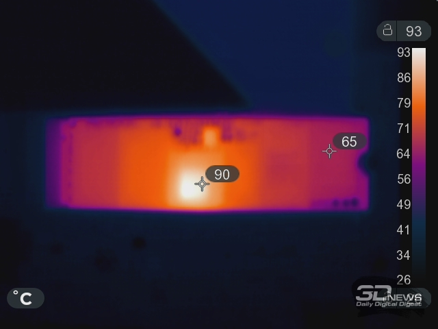 As alterações de hardware feitas na plataforma Phison E18 no Digma Top P8 tiveram um efeito positivo no regime de temperatura do drive. Este modelo não aquece tanto quanto um SSD com memória Micron de 176 camadas. E isso se aplica tanto aos chips NAND quanto ao chip base real. A temperatura máxima da superfície do controlador registrada sob carga no Top P8 foi de 90 graus e o aquecimento da memória foi limitado a 65 graus. Vale lembrar que em testes de um drive similar com memória Micron, a temperatura do chip Phison PS5018-E18 chegou a 102 graus.