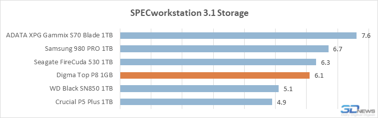 O teste SPECworkstation simula cenários de carregamento de disco que são típicos de aplicativos com uso intenso de recursos e estações de trabalho de alto desempenho. Do seu ponto de vista, o Digma Top P8 está entre os discos suficientemente rápidos, mas ainda tem desempenho inferior ao Samsung 980 PRO e Seagate FireCuda 530. Além disso, o disco ADATA XPG Gammix S70 baseado na plataforma Innogrit IG5236 também pode apresentam um desempenho significativamente melhor.