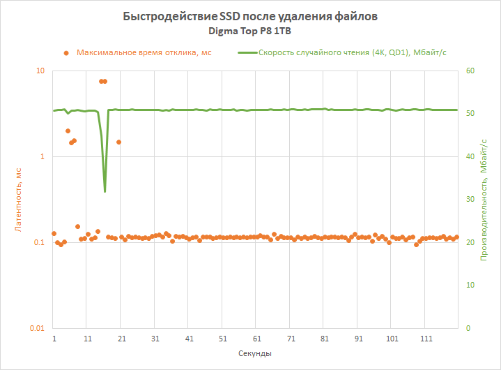 Ao excluir arquivos grandes, o Digma Top P8 se comporta como um SSD em um controlador Phison E18. Alguns segundos após o apagamento (no experimento em questão, 8 arquivos de 8 GB cada um são excluídos), a unidade fica lenta por alguns segundos. A velocidade de leitura é reduzida em cerca de uma vez e meia, e o atraso aumenta em uma ordem e meia de magnitude.