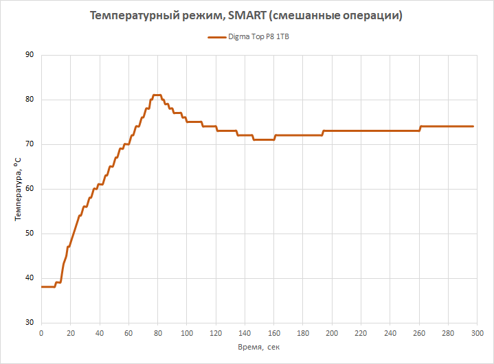 O pico no gráfico acima corresponde ao momento em que o espaço no cache do SLC se esgota. Isso significa que o Digma Top P8 aquece notavelmente mais quando as operações de gravação são executadas no modo rápido. Tal inflexão na curva de temperatura é outra característica do drive Digma. Efeitos semelhantes não foram observados com SSDs relacionados com memória Micron.