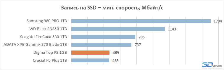 Em termos de velocidade mínima de gravação, o Digma Top P8, pelo contrário, é quase o pior dos carros-chefe. Um indicador de 469 MB / s é obtido quando toda a capacidade do SSD é concluída, quando o array de memória flash já mudou para o modo TLC e o controlador está simultaneamente engajado na transferência de células preenchidas de um estado de um bit para um de três bits .