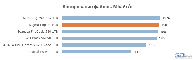 Assim, a principal reivindicação do Digma Top P8 é a baixa velocidade de gravação quando o array de memória flash está operando no modo TLC. Em outros casos, a unidade lida muito bem com operações simples de arquivos, mesmo quando comparada com soluções emblemáticas.