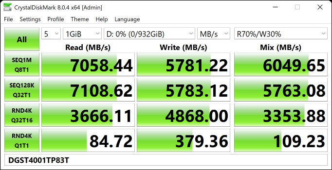O teste foi realizado no sistema operacional Microsoft Windows 11 Pro (21H2) Build 22000.282.0 com a atualização KB5008353 instalada, que corrige o desempenho do SSD durante operações de gravação aleatória. O sistema usou o driver Microsoft Standard NVMe Express Controller 10.0.18362.1.