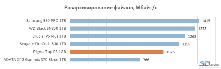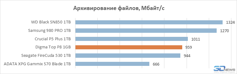 Ao copiar arquivos dentro do drive, o Digma Top P8 mostra uma velocidade bastante típica dos carros-chefe. Mas ao arquivar e desarquivar, quando o fluxo de trabalho enfrentado pelo controlador é assimétrico, os resultados relativos do Top P8 pioram. É inferior aos carros-chefe da Samsung e WD, bem como ao Seagate FireCuda 530, uma unidade semelhante baseada na plataforma Phison E18 com memória Micron.