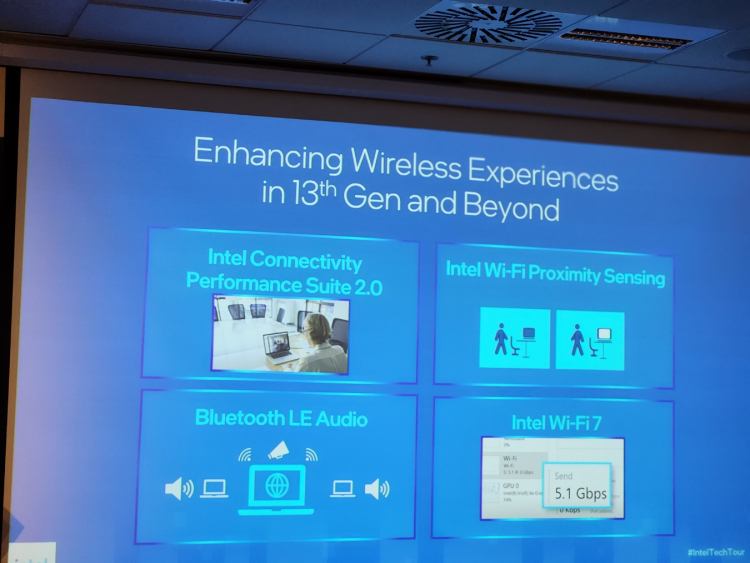 Além das informações da VPU, a Intel também revelou que os chips Raptor Lake e as futuras gerações de processadores suportarão novas tecnologias de rede sem fio. Em particular, a empresa mencionou o desenvolvimento de um novo pacote de software Intel Connectivity Performance Suite 2.0. Ele fornecerá suporte para tecnologias Wi-Fi Proximity Sensing (monitora mudanças na frequência Wi-Fi e usa os dados recebidos para detectar movimento na sala), Bluetooth LE Audio e Wi-Fi 7.