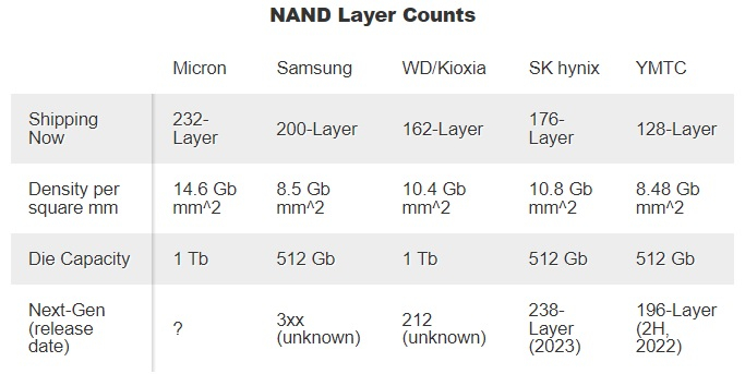 A empresa observa que já iniciou as entregas de novos chips de memória flash NAND TLC 3D de 232 camadas para OEMs, bem como novos SSDs Crucial baseados neles (modelos não especificados). A Micron lançou recentemente a produção de novos chips e continuará aumentando a produção ao longo do restante de 2022.