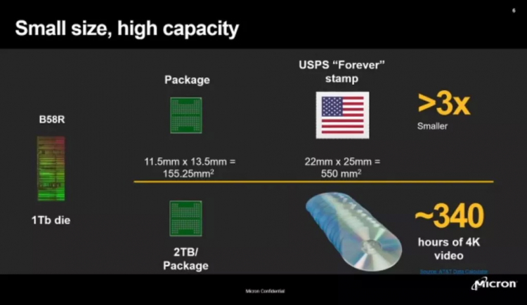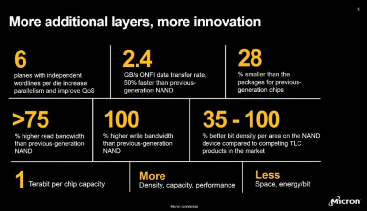 Até dezesseis chips de memória flash 3D NAND TLC de 232 camadas podem ser combinados em um pacote de 11,5 × 13,5 mm, obtendo assim um chip de 2 TB com um terço do tamanho de um selo postal dos EUA. Com o layout mais denso, até 14,6 Gb de informações podem ser gravadas por 1 mm2, o que é 30-100% mais do que os produtos concorrentes fornecidos ao mercado. De acordo com a Micron, um desses chips pode armazenar 340.000 horas de vídeo 4K.