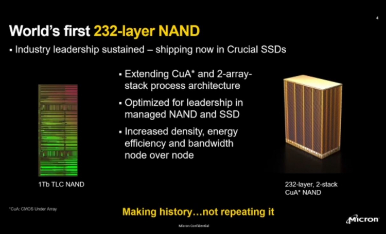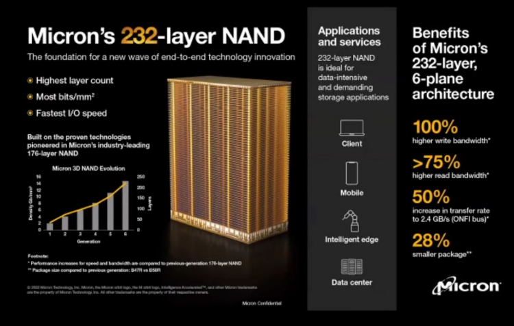 A empresa observa que já iniciou as entregas de novos chips de memória flash NAND TLC 3D de 232 camadas para OEMs, bem como novos SSDs Crucial baseados neles (modelos não especificados). A Micron lançou recentemente a produção de novos chips e continuará aumentando a produção ao longo do restante de 2022.