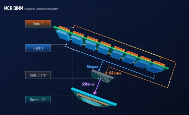 O conceito de MRDIMM é combinar dois módulos DDR5 e usar os dois níveis ao mesmo tempo. Por exemplo, ao combinar dois módulos DDR5 com uma velocidade de 4400 MT/s dessa forma, a saída será de 8800 MT/s. De acordo com os desenvolvedores, um buffer de dados especial ou multiplexador é usado para isso – ele combina todas as classificações e converte dois DDRs (Double Data Rate – taxa de dados dupla) em um QDR (Quad Data Rate – quatro vezes a taxa de dados).