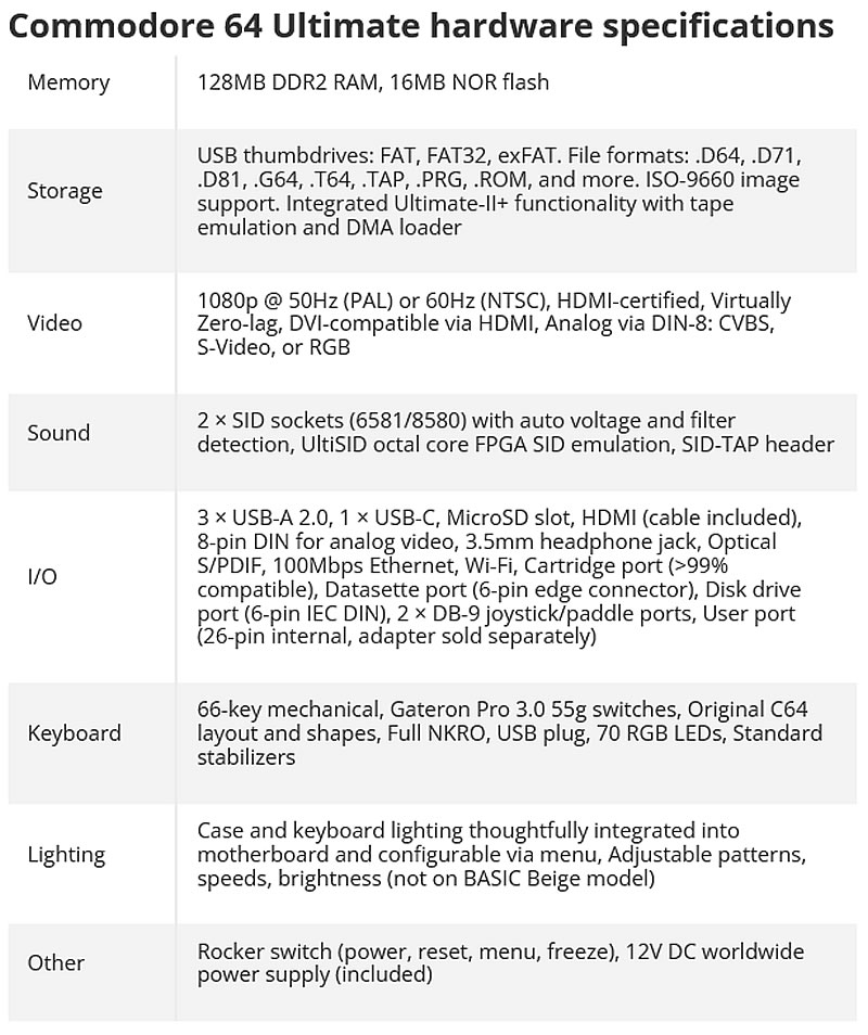 O Commodore 64 Ultimate está disponível em três variantes, diferindo principalmente no design. A versão BASIC Bege, de US$ 299, tem um gabinete bege clássico sem retroiluminação.