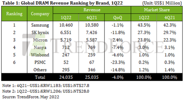 Especialistas observam que o aumento contínuo da demanda por memória DRAM do mercado de PCs e da indústria automotiva permitiu à Micron, uma das três maiores fabricantes mundiais desse tipo de memória, aumentar sua receita em 2,4% no primeiro trimestre. Os fabricantes sul-coreanos Samsung e SK hynix tiveram menos sorte, com receitas caindo 1,1% e 11,8%, respectivamente. Essas duas empresas respondem por 70,8% da produção mundial de memória DRAM.