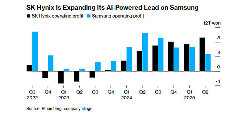 A receita da Samsung com a venda de memórias de computador, incluindo DRAM e NAND, totalizou 21,2 trilhões de wons (cerca de US$ 15,2 bilhões) no período de abril a junho, abaixo dos 21,8 trilhões de wons registrados pela SK Hynix na semana anterior. O sucesso da empresa sediada em Icheon, Coreia do Sul, foi impulsionado por sua memória de alta largura de banda (HBM) de alto desempenho, usada em chips de IA. A participação de mercado da SK Hynix em HBM atingiu 62%, enquanto a Samsung controla apenas 17% do segmento e ainda não recebeu aprovação da Nvidia para lançar sua versão mais avançada de HBM, de acordo com dados da Counterpoint Research.