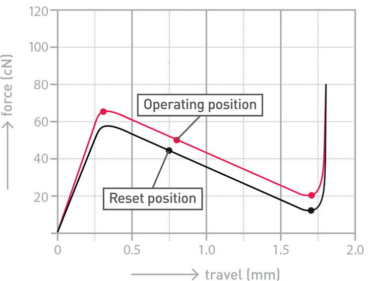 Assim como o MX Ultra Low Profile Click, o novo MX Ultra Low Profile Tactile tem deslocamento de chave de 1,8 mm e apenas 0,8 mm para o ponto de atuação. O fabricante observa a força de atuação necessária para o feedback tátil para os novos interruptores no nível de 65 gramas. O recurso declarado do MX Ultra Low Profile Tactile é de 50 milhões de cliques.