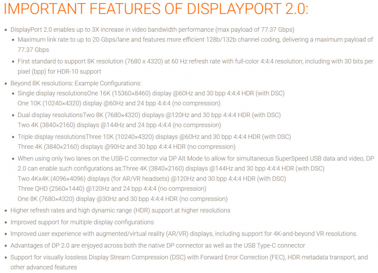 A versão mais recente do padrão DisplayPort 2.0 tem maior largura de banda do que seus antecessores. O padrão permite que conteúdo não compactado em 8K/60Hz/HDR, 4K/240Hz/HDR, bem como dois fluxos de 4K/120Hz/HDR e quatro fluxos de 4K/60Hz/HDR sejam transmitidos por meio de um único cabo.