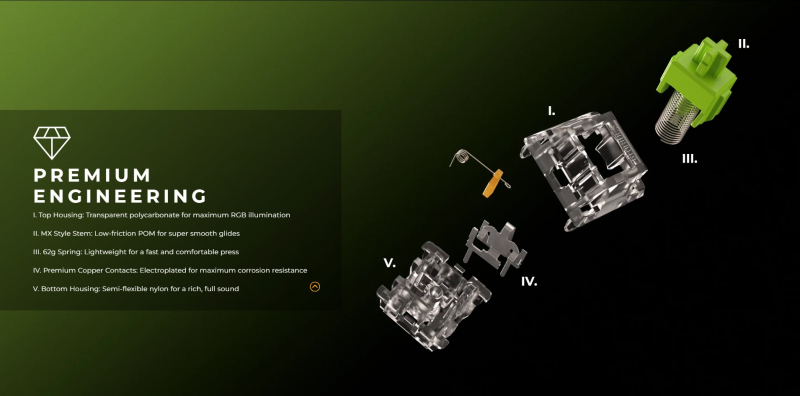 A parte inferior da carcaça do interruptor Glorious Raptor é feita de polímero de nylon semirrígido, enquanto a parte superior é feita de policarbonato transparente para aumentar o efeito da iluminação RGB. Pinos feitos de poliformaldeído de baixo atrito, combinados com lubrificação de fábrica, fornecem um deslizamento ultrasuave para toques de tecla mais rápidos e confortáveis.