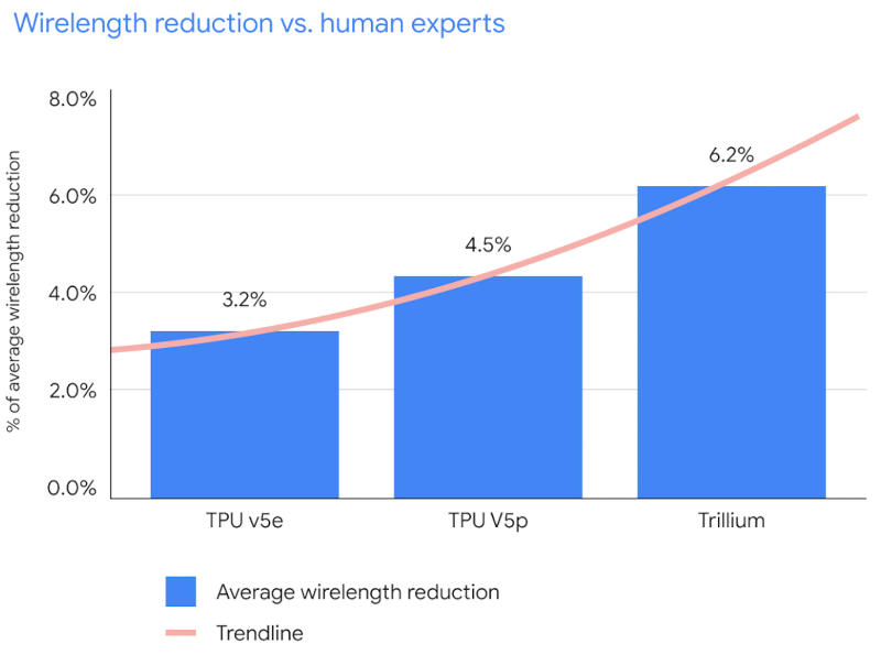 O projeto de chip ou design de chip é o estágio mais longo e trabalhoso no desenvolvimento de um componente semicondutor. A Synopsys, que fabrica software de design de chips, implementou IA para resolver esse problema, mas seu produto tem um preço muito alto. O Google decidiu democratizar essa abordagem. Atualmente, a criação de um plano de matriz para um chip complexo como uma GPU leva cerca de dois anos se for projetado por humanos. Componentes menos complexos podem ser projetados em poucos meses, mas o processo envolve milhões em custos porque os grandes fabricantes empregam um número significativo de especialistas. AlphaChip, segundo o Google, resolve o problema em poucas horas. Além disso, este sistema oferece resultados superiores, otimizados para desempenho e eficiência energética. O Google também exibiu um gráfico que mostra a redução no comprimento do fio nas versões anteriores do TPU e no novo Trillium.