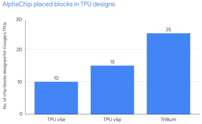 O Google tem usado o AlphaChip para desenvolver aceleradores TPU AI desde 2020, onde a empresa executa modelos de IA em grande escala e serviços em nuvem. Os modelos de transformadores são executados nesses processadores – esta arquitetura é usada no Gemini e no Imagen. O sistema AlphaChip ajudou a melhorar o design de cada geração sucessiva de TPUs, incluindo o mais recente Trillium, reduzindo o tempo de desenvolvimento e proporcionando maior desempenho. No entanto, tanto a Google como a MediaTek utilizam este sistema para um conjunto limitado de blocos, e uma parte significativa do trabalho ainda é feita por humanos.