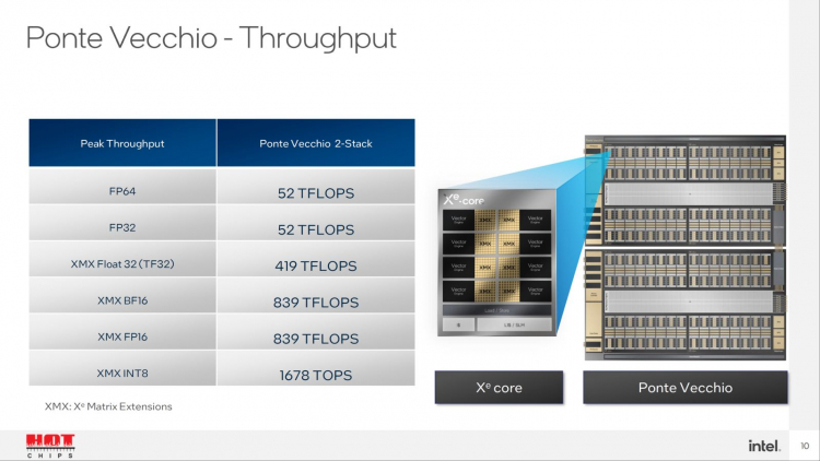 Como parte da conferência HotChips 34, a Intel compartilhou novos detalhes sobre os próximos aceleradores de computação de servidor Ponte Vecchio, que combinam 63 elementos individuais (47 funcionais, incluindo GPU) em um substrato. Em particular, os especialistas da empresa falaram sobre o rendimento e desempenho máximos do acelerador Ponte Vecchio em cálculos de precisão simples e dupla.