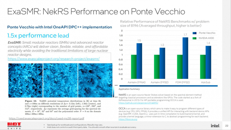 Em cargas de trabalho Data Parallel C++ (DPC++), os aceleradores Ponte Vecchio oferecem desempenho 1,4 a 2,5 vezes mais rápido do que os aceleradores de servidor NVIDIA A100, de acordo com a Intel. A Intel também forneceu dados de desempenho para sua solução no ExaSMR OpenMC (Modern Monte Carlo Code for Research and Development), onde a Ponte Vecchio oferece o dobro do desempenho. E no NekRS (para resolver as equações de Navier-Stokes), a solução Intel apresenta desempenho 1,3-1,7 vezes maior que o concorrente.