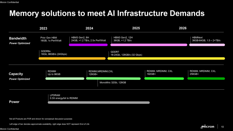 O roteiro da Micron também indica que a empresa planeja iniciar a produção em massa de chips de memória GDDR7 de 16 GB e 24 GB com taxas de transferência de dados de 32 GT/s (gigatransfers por segundo) a partir de meados de 2024. Além disso, ela está trabalhando na memória HBMNext. Essa nova geração de memória de alto desempenho deve fornecer largura de banda de 1,5 TB/s a mais de 2 TB/s por pilha em capacidades que variam de 36 GB a 64 GB. Anteriormente, o fabricante introduziu a memória HBM3 Gen2 com largura de banda de 1,2 TB / s, que é 44% mais rápida que o HBM3 convencional.