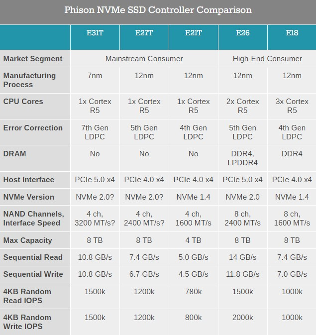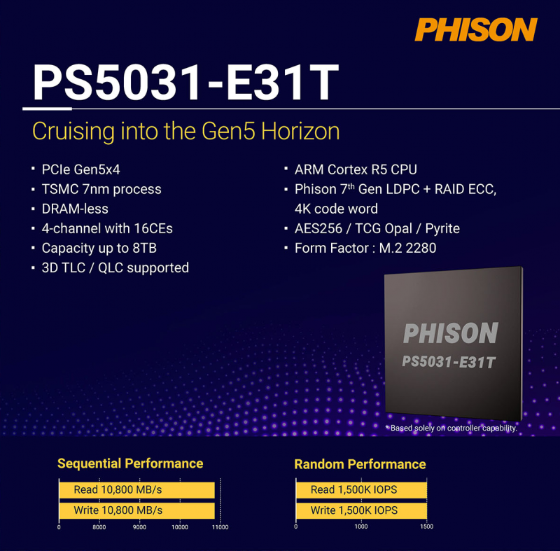 “Na Computex 2023, a Phison revelou um novo controlador para SSDs de consumo PCIe 5.0 acessíveis. O novo Phison PS5031-E31T é um controlador sem buffer de quatro canais para SSDs que pode fornecer velocidades sequenciais de leitura e gravação de até 10,8 GB/s e está disponível em volumes de até 8 TB.