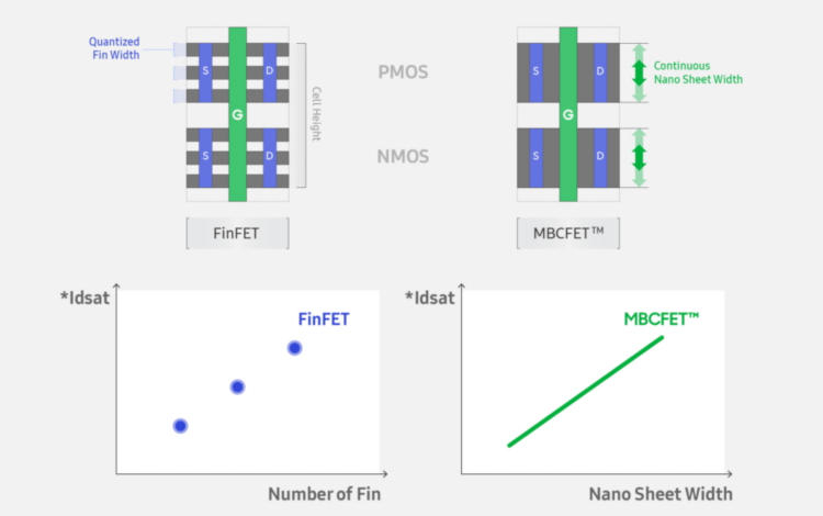 Espera-se que a indústria de semicondutores mude para nanofolhas GAAFET quando a tecnologia FinFET padrão de hoje esgotar suas capacidades. Cada um dos maiores fabricantes do mundo, à sua maneira, denota a implementação desta tecnologia. A Intel tem RibbonFET, enquanto a Samsung tem MBCFET (FET de canal de várias pontes). Mas em todos os casos, um princípio é usado – largura variável e número de canais de nanofolha condutora, o que torna possível melhorar o controle sobre a corrente. Os FinFETs usam várias aletas (ou “aletas”) para fornecer um tamanho de canal fixo, enquanto o GAAFET permite que os tamanhos dos canais sejam variados e o transistor pode ser otimizado para cada tarefa específica – aumentando o desempenho ou reduzindo o consumo de energia.