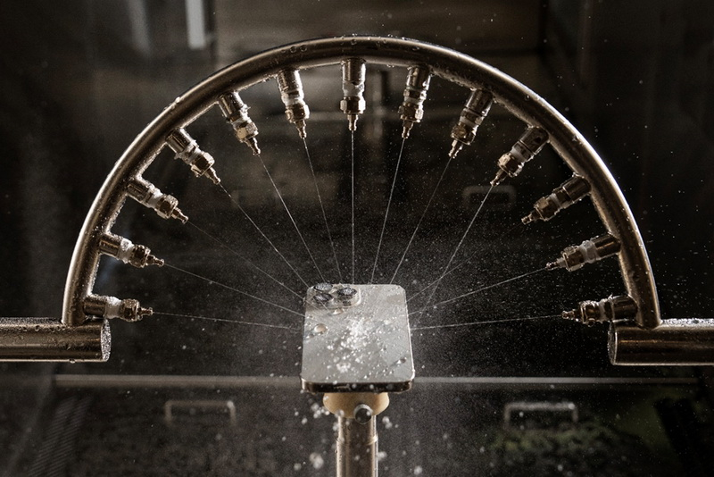 «Os testes de câmara IPX começam com um teto com gotejamento, simulando condições de chuva e condições normais de respingos de água no dispositivo. Em seguida, é simulada a exposição direta à água pressurizada de todos os ângulos. Após a aprovação no teste, o produto recebe a classificação IPX5. Em seguida, é realizado um teste de pulverização de água de alta pressão à distância, que, se aprovado, confere ao dispositivo a classificação IPX6. Por fim, há os testes em tanque de água pressurizada, que simulam a imersão do dispositivo em água. Se o dispositivo suportar a imersão a profundidades de um e seis metros sem danos, o produto recebe as classificações IPX7 e IPX8, respectivamente.