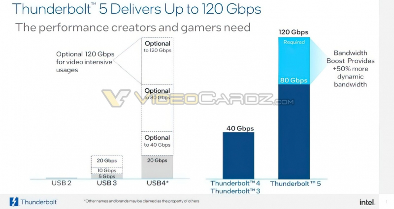 Em outubro passado, a Intel anunciou planos para lançar uma nova geração da interface Thunderbolt. Hoje a empresa apresentou oficialmente o Thunderbolt 5. Suportado pela nova tecnologia Bandwidth Boost, o novo padrão oferece velocidades de transferência de dados de até 120 Gbps. Em sua configuração padrão, o Thunderbolt 5 oferece transferência de dados a 80 Gbps em ambas as direções. No entanto, em configurações de vários monitores com altas resoluções e taxas de atualização, os requisitos de largura de banda aumentam, de modo que o Thunderbolt 5 pode ser configurado para velocidades de transferência de até 120 Gbps. Nesses cenários de uso, a velocidade de recepção pode ser ajustada de forma flexível, variando de 80 Gbit/s a 40 Gbit/s.