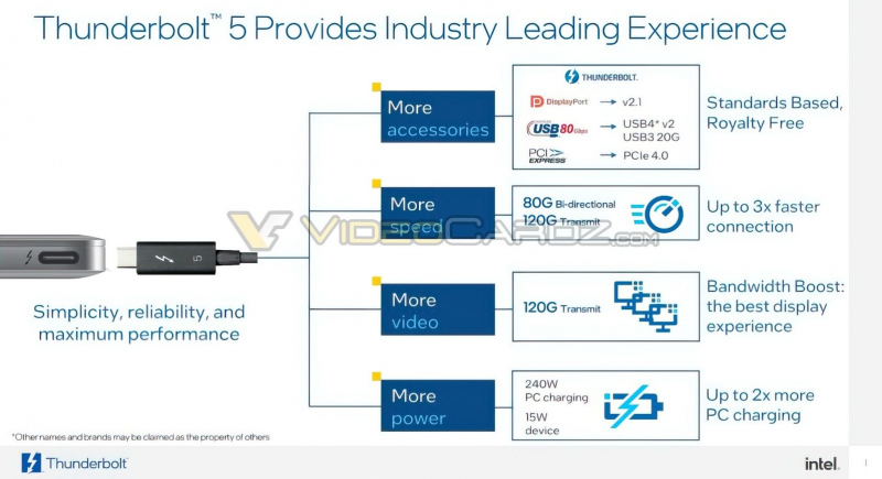 A nova interface Thunderbolt 5 é compatível com versões anteriores de Thunderbolt 4 e Thunderbolt 3, bem como compatível com DisplayPort 2.1, USB4, USB 3.2 20G e PCI 4.0. Além disso, o novo padrão suporta até 240 W de energia para serem enviados a um dispositivo externo, eliminando a necessidade de fontes de alimentação e cabos separados para laptops equipados com Thunderbolt. A inclusão do suporte ao protocolo PCI 4.0 no Thunderbolt 5 significa que a interface tem maior potencial de fornecimento de throughput, por exemplo, ao conectar placas de vídeo externas, e neste caso está livre das limitações associadas ao mesmo Thunderbolt 3 e Thunderbolt 4. Porém, para a plena implementação desse sistema o suporte com placas de vídeo externas deve ser equipado com barramentos PCIe capazes de operar a 64 Gbps.