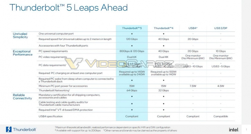 A atualização mais notável do Thunderbolt 4 é a capacidade de conectar dois monitores 4K ou um monitor 8K. Além disso, o Thunderbolt 4 recebeu especificações do padrão USB4, bem como a capacidade de transferir até 100 W de potência para um dispositivo conectado, em particular para um laptop, ao mesmo tempo que fornece velocidades de transferência de dados de 32 Gbps. No entanto, apesar de todas essas melhorias, o rendimento máximo total do Thunderbolt 3 e Thunderbolt 4 permanece o mesmo em 40 Gbps. Além disso, operam de acordo com o antigo protocolo PCIe 3.0.