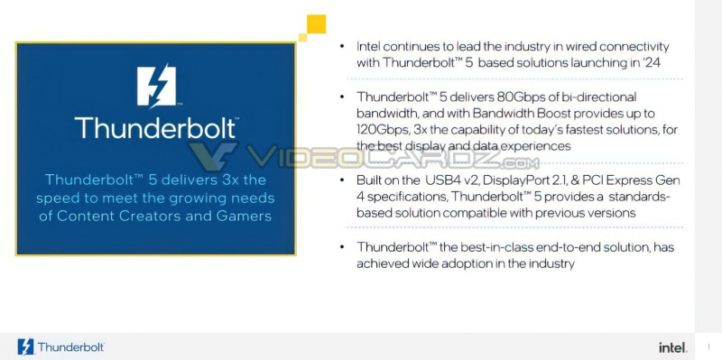 Em outubro passado, a Intel anunciou planos para lançar uma nova geração da interface Thunderbolt. Hoje a empresa apresentou oficialmente o Thunderbolt 5. Suportado pela nova tecnologia Bandwidth Boost, o novo padrão oferece velocidades de transferência de dados de até 120 Gbps. Em sua configuração padrão, o Thunderbolt 5 oferece transferência de dados a 80 Gbps em ambas as direções. No entanto, em configurações de vários monitores com altas resoluções e taxas de atualização, os requisitos de largura de banda aumentam, de modo que o Thunderbolt 5 pode ser configurado para velocidades de transferência de até 120 Gbps. Nesses cenários de uso, a velocidade de recepção pode ser ajustada de forma flexível, variando de 80 Gbit/s a 40 Gbit/s.
