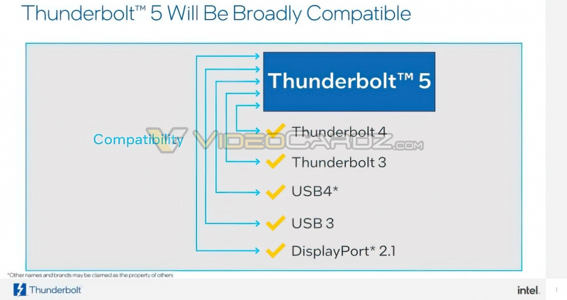 A nova interface Thunderbolt 5 é compatível com versões anteriores de Thunderbolt 4 e Thunderbolt 3, bem como compatível com DisplayPort 2.1, USB4, USB 3.2 20G e PCI 4.0. Além disso, o novo padrão suporta até 240 W de energia para serem enviados a um dispositivo externo, eliminando a necessidade de fontes de alimentação e cabos separados para laptops equipados com Thunderbolt. A inclusão do suporte ao protocolo PCI 4.0 no Thunderbolt 5 significa que a interface tem maior potencial de fornecimento de throughput, por exemplo, ao conectar placas de vídeo externas, e neste caso está livre das limitações associadas ao mesmo Thunderbolt 3 e Thunderbolt 4. Porém, para a plena implementação desse sistema o suporte com placas de vídeo externas deve ser equipado com barramentos PCIe capazes de operar a 64 Gbps.