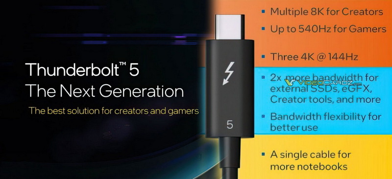 Em outubro passado, a Intel anunciou planos para lançar uma nova geração da interface Thunderbolt. Hoje a empresa apresentou oficialmente o Thunderbolt 5. Suportado pela nova tecnologia Bandwidth Boost, o novo padrão oferece velocidades de transferência de dados de até 120 Gbps. Em sua configuração padrão, o Thunderbolt 5 oferece transferência de dados a 80 Gbps em ambas as direções. No entanto, em configurações de vários monitores com altas resoluções e taxas de atualização, os requisitos de largura de banda aumentam, de modo que o Thunderbolt 5 pode ser configurado para velocidades de transferência de até 120 Gbps. Nesses cenários de uso, a velocidade de recepção pode ser ajustada de forma flexível, variando de 80 Gbit/s a 40 Gbit/s.