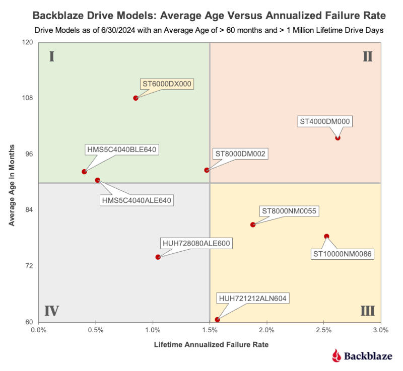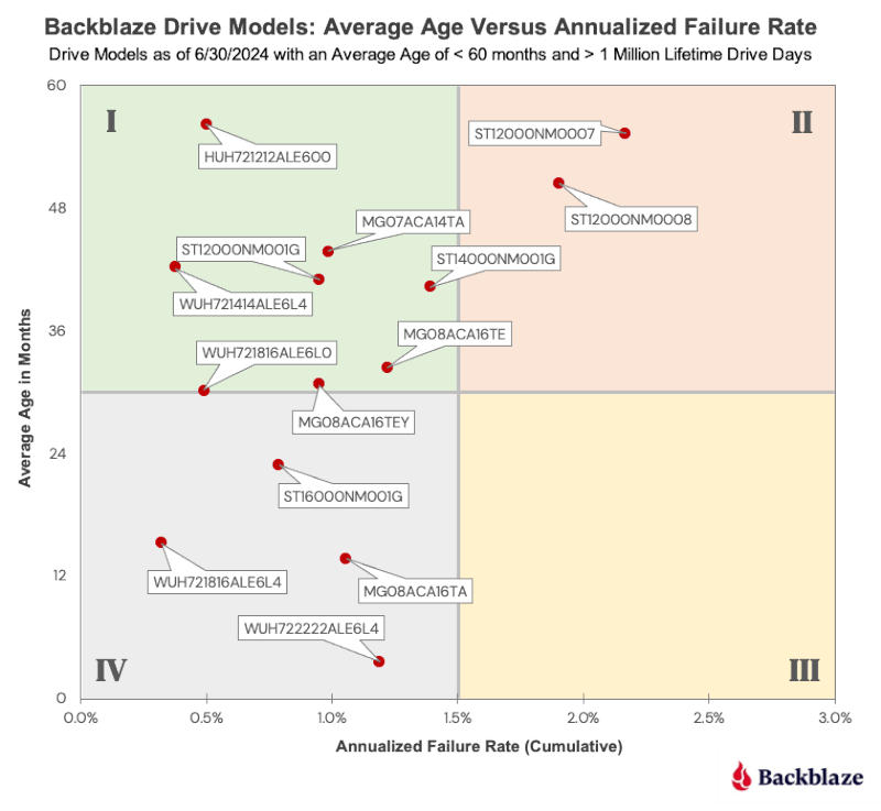 O objetivo de coletar e processar essas estatísticas é criar um perfil de falha de cada unidade ao longo do tempo, explicou Backblaze, o que ajudará a desenvolver estratégias de substituição e migração. Isto é ilustrado por três diagramas propostos pela empresa, compilados com base em estatísticas de falhas de modelos, cujas cópias estão em uso na empresa há um total de 1 milhão de dias ou mais. O primeiro gráfico mostra AFRs para 14 modelos com idade média de 60 meses ou menos, e o segundo gráfico mostra AFRs para modelos com idade média superior a 60 meses. Esta divisão foi escolhida porque 60 meses é um período de garantia típico para discos rígidos de classe empresarial.