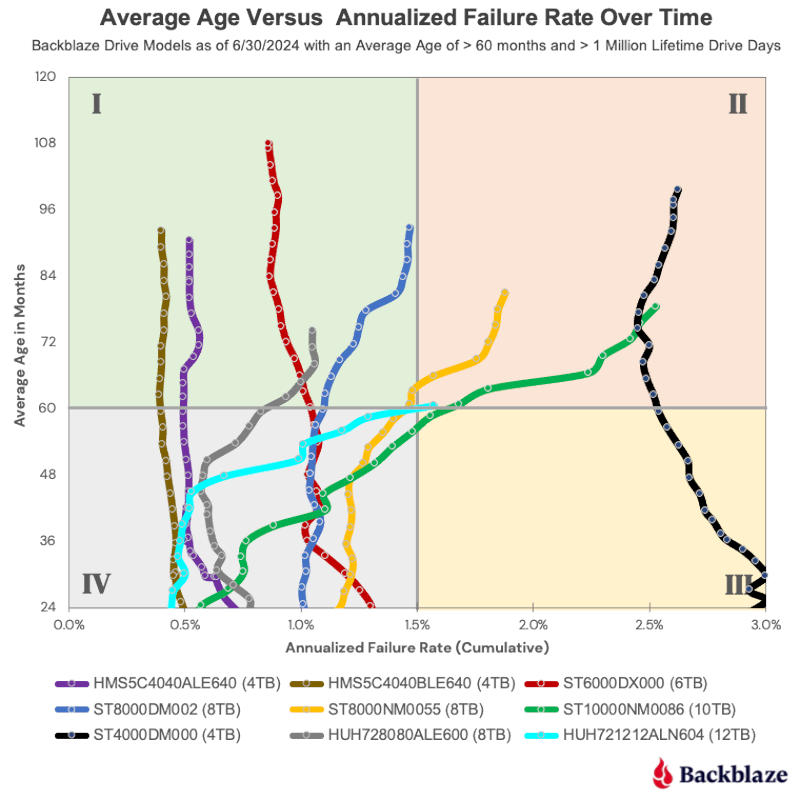 Para mostrar a dinâmica das falhas, foi compilado um terceiro diagrama. Ele mostra a taxa de falhas durante toda a vida útil de nove modelos com mais de 60 meses – para maior clareza, a contagem regressiva começa em 24 meses. A distribuição é predominantemente nos quadrantes I e II, com cinco dos nove modelos do segundo trimestre de 2024 terminando no quadrante I. Modelos cujas linhas são quase verticais (vermelho, marrom e roxo) apresentam uma taxa de falha estável ao longo do tempo. Os modelos das linhas azul e cinza aumentam sua taxa de falhas à medida que envelhecem – a linha azul em particular (Seagate ST800DM002) está dentro dos limites normais, uma vez que sua AFR permaneceu em torno de 1% durante os primeiros 60 meses. Os três modelos que atingiram o quadrante III têm perfis semelhantes – suas curvas se curvam cada vez mais para a direita à medida que a taxa de falhas aumenta. Por fim, a linha preta é um disco Seagate de 4 TB que está “migrando ativamente” e sendo substituído por outros.
