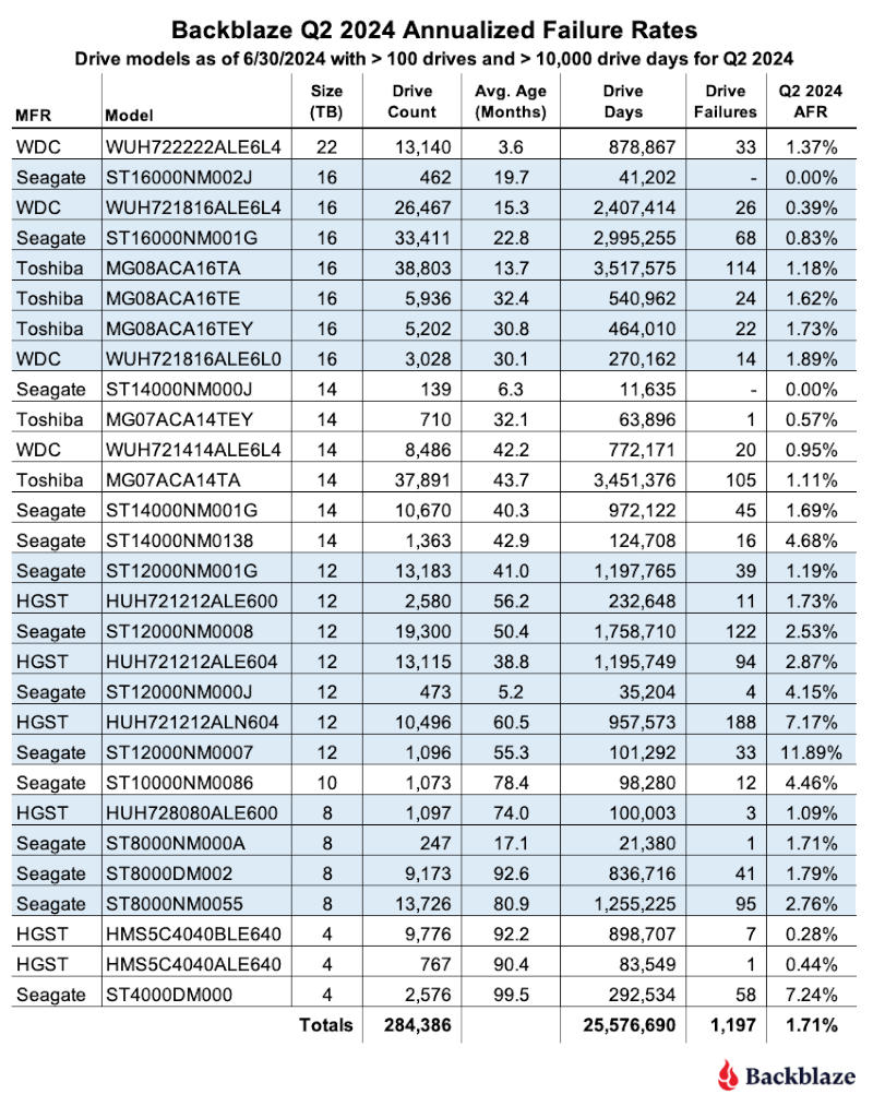 O último relatório constatou que a taxa média anual de insucesso (AFR) do segundo trimestre foi de 1,71%, inferior aos 2,28% registados no mesmo período do ano passado, mas superior aos 1,41% do primeiro trimestre de 2024. A maior preocupação foi o HGST de 12 TB (HUH721212ALN604), cujo AFR saltou para 7,17% no período, elevando sua taxa de vida útil de 0,99% para 1,57%. Vale ressaltar também que dois modelos – Seagate 14 TB ST14000NM000J e 16 TB ST16000NM002J – não apresentaram nenhuma falha durante o trimestre. Mas o Backblaze tem um número relativamente pequeno dessas unidades em serviço.