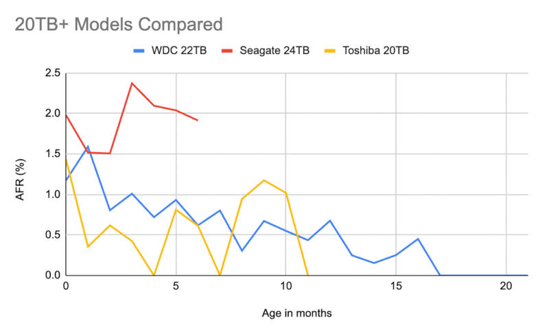Os modelos com mais de 20 TB são relativamente novos no mercado, portanto, suas estatísticas de falhas ainda são instáveis e podem não refletir totalmente a realidade. Para esclarecer a situação, a Backblaze comparou os resultados atuais com o desempenho dos modelos de 14 a 16 TB no início de sua vida útil e concluiu que as unidades com mais de 20 TB estão atingindo o desempenho esperado e podem até superar as expectativas. Um ciclo de vida “saudável” de um disco rígido é descrito por uma curva em U, com taxas de falhas relativamente altas no início e no fim de sua vida útil e baixas no meio. No entanto, é muito cedo para tirar conclusões sobre o comportamento dos novos modelos; a Backblaze decidiu dar a eles mais tempo para se provarem.
