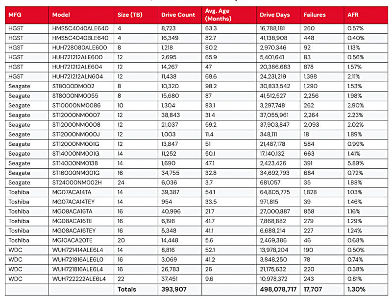 Não houve falhas registradas para os discos rígidos Seagate ST8000NM000A (8 TB) e ST16000NM002J (16 TB) no último trimestre, com o primeiro modelo passando três trimestres consecutivos sem uma única falha. A taxa de falha média anual (AFR) geral para todos os modelos no estoque da Backblaze (393.907 unidades) durante toda a sua vida útil no segundo trimestre foi de 1,30%, o que equivale a 17.707 falhas. No trimestre anterior, a AFR geral foi de 1,31%.