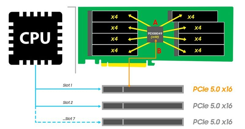 O PCIe 5.0 Rocket 1608A pode acomodar até oito SSDs M.2 NVMe, com uma velocidade total de 56 GB/s alcançada usando quatro SSDs PCIe 5.0 de alta velocidade ou oito PCIe 4.0. Ao equipar a placa com oito unidades de 8 TB cada, você pode obter 64 TB de armazenamento com enorme rendimento.