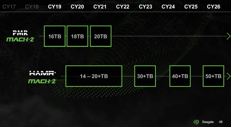 Discos rígidos de grande capacidade serão procurados em sistemas de armazenamento em nuvem por um longo tempo, então a Seagate Technology constrói seus planos para seu desenvolvimento evolucionário nos próximos anos. Como segue desses planos, a tecnologia de gravação magnética perpendicular se tornará obsoleta após o lançamento de um disco rígido de 24 TB, a tecnologia de “gravação lado a lado” será usada e a gravação magnética aquecida (HAMR) dará vida aos discos rígidos de 32 a 50 TB.