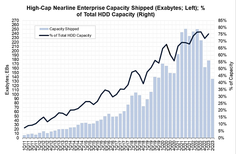 De acordo com Aaron Rakers, analista da Wells Fargo, as remessas globais de unidades Nearline no período do relatório totalizaram cerca de 9,5 milhões de unidades. Sua capacidade total é de aproximadamente 136 EB, 45% a menos que no ano passado.
